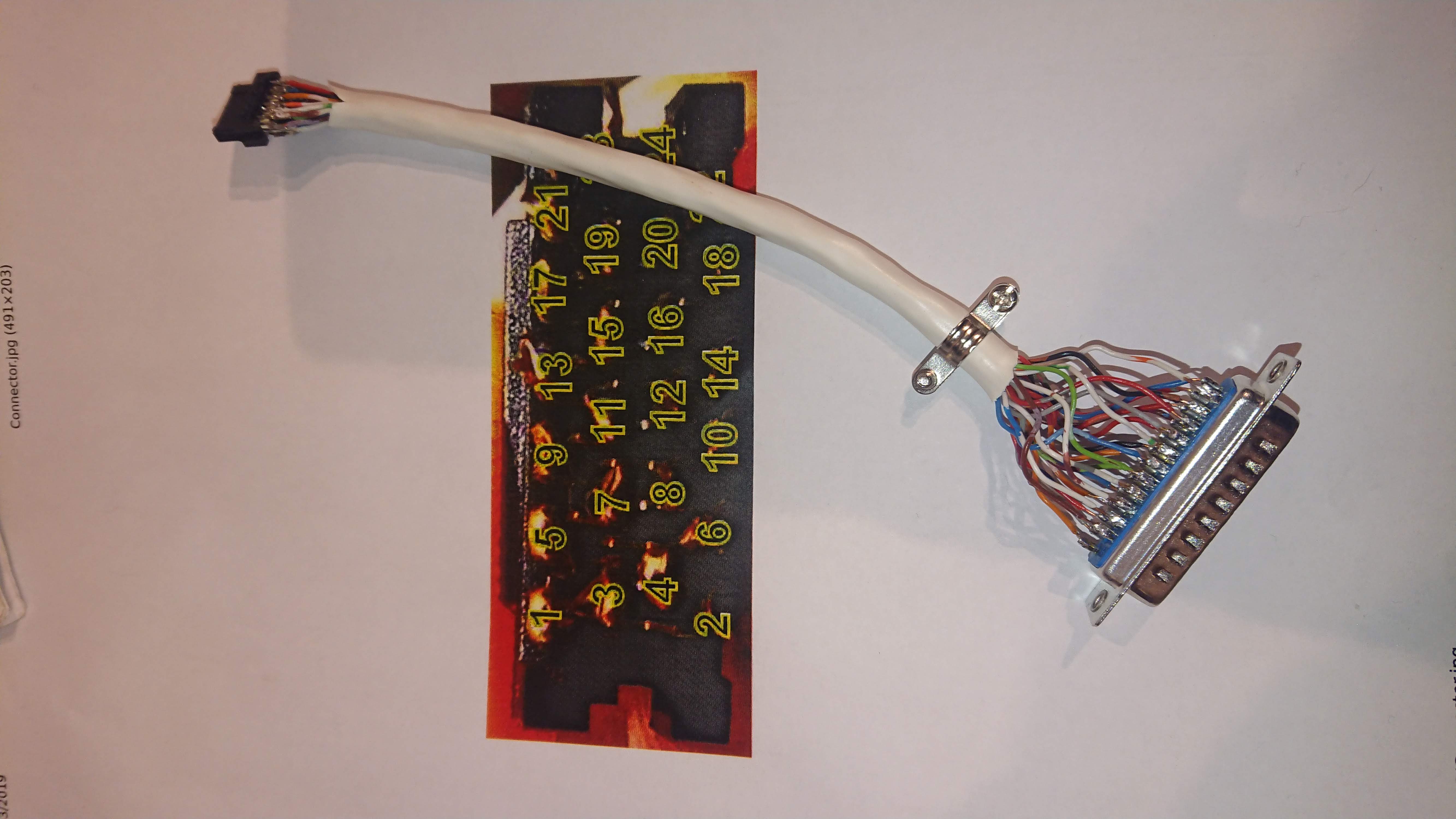 To this end, I set about constructing my own using the connectors which can be purchased at multi-com.pl. I got some 24-core signal cable used to wire in burglar alarms, and built a cable terminating in a DB25 connector, so I can use it for multiple boards (e.g. Wiz, Caanoo) in the future.